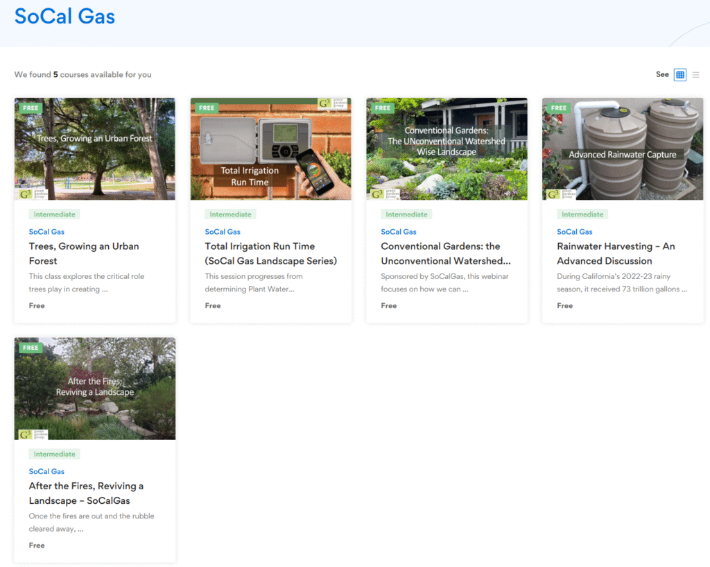 SoCal Gas Pro Workshops Professional Landscape Classes Sponsored By Southern California Gas Company & Metropolitan Water District of Southern California Build Healthy Soil Capture Rainwater as a Resource Select Climate-Appropriate Plants Use Highly Efficient Irrigation Watershed Wise Landscape Professional Certification – SoCalGas 10/08/2025 - 10/09/2025 at 8:00 AM - 4:30 PM SoCal Gas Energy Resource Center Register Now Loading Missed a Live Class? Check out classes On-Demand: Anywhere, anytime, don’t miss vital information about landscaping. Check Out On-Demand Classes Additional Resources Metropolitan Water District Waterwise Garden Guidebook Green Your Concrete Footprint Urban Permeability About Pamela Berstler Thought-leader on the Watershed Approach to landscaping and the role gardens play in pushing back against climate change. View all posts by Pamela Berstler →