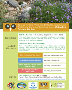Join us in Meiners Oaks, CA on Saturday, September 10th, 2016 for a three hour Watershed Wise and Ocean Friendly Landscape Class hosted by the County of Ventura and Surfrider Foundation’s Ocean Friendly Gardens Program Ventura Committee.